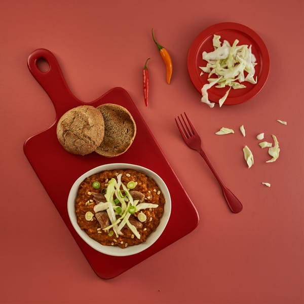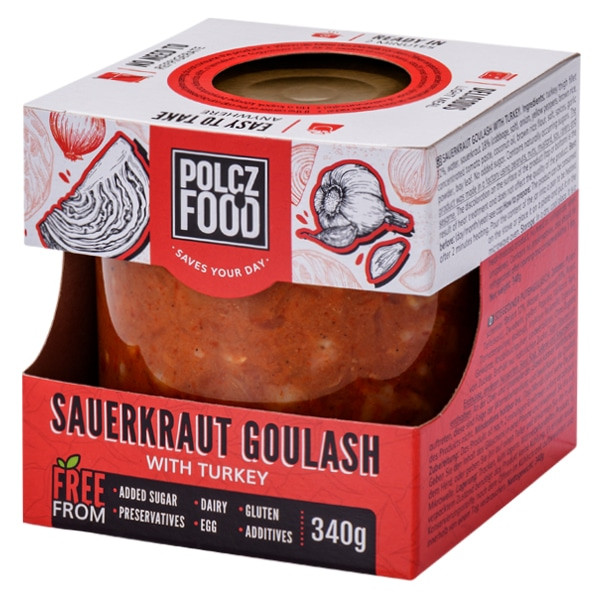 Zutaten: Putenkeulenfilet 32%, Trinkwasser, Vecsés-Sauerkraut 18% (Kopfkohl, Speisesalz), rote Zwiebel, brauner Reis, Paprika, konzentrierte Tomaten, Kokosöl, braunes Reismehl, Speisesalz, Gewürze, Knoblauchpulver, Lorbeerblatt